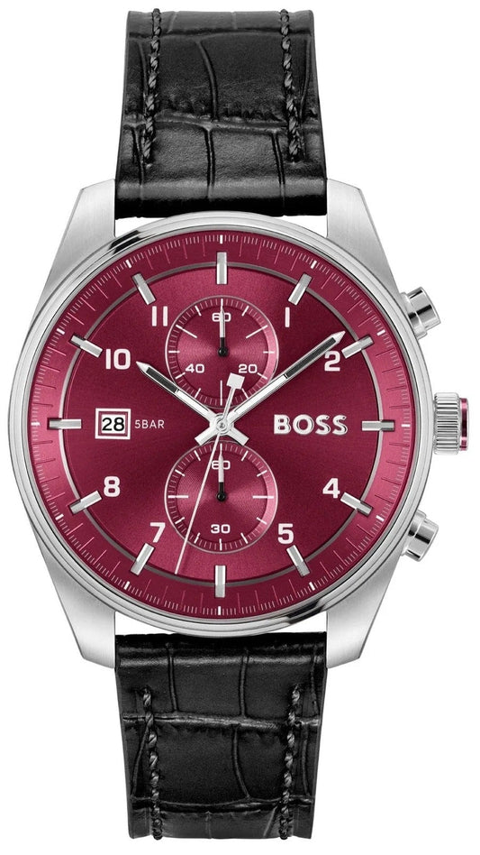 Hugo Boss Skytraveller Chronograph Burgundy Red Dial Black Leather Strap Watch for Men - 1514193