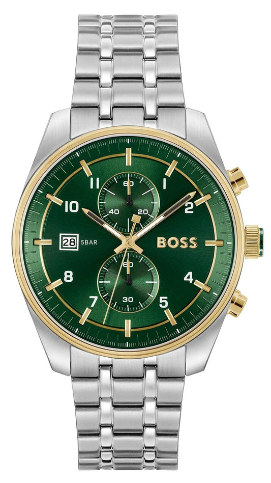 Hugo Boss Skytraveller Chronograph Green Dial Silver Steel Strap Watch for Men - 1514195