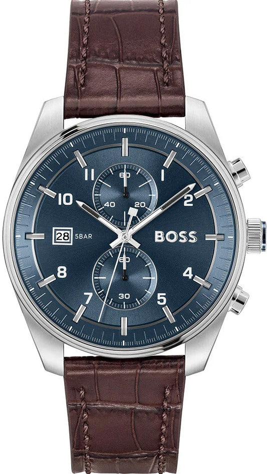 Hugo Boss Skytraveller Chronograph Blue Dial Brown Leather Strap Watch for Men - 1514194