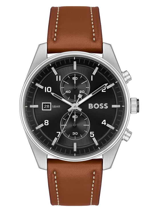 Hugo Boss Skytraveller Chronograph Silver Dial Black Leather Strap Watch for Men - 1514147