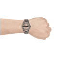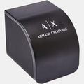 Gunmetal ion-plated stainless steel case and bracelet. Fixed gunmetal ion-plated bezel. Light grey etched dial with gunmetal hands and index hour markers. Arabic numeral minute markers (at 5 minute intervals). Minute markers around the outer rim. The Armani Exchange logo appears at the 12 o'clock positions.