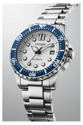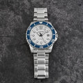 Citizen NJ0171-81A Metal Band Men Watch. The case is made out of silver stainless steel with a blue bezel, which stands for the high quality of the item, it has a white color dial. This model has got 100 meters of water resistance. it can be worn in scenarios where it is likely to be splashed but not immersed in water and will be fine in rain. The watch is shipped with an original box and a guarantee from the manufacturer.