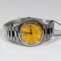 Under an anti-reflective sapphire glass, the sporty watch has a sunshine yellow dial with a date window at 3 o'clock and contrasting silver-colored details that highlight its classic aesthetic. Powered by an automatic movement and water-resistant to 50 meters, this stylish watch is suitable for everyday use at work, free time and everything in between. Caliber 8210.