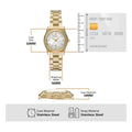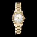 This 32mm watch features a glossy, white mother-of-pearl dial, three-hand date movement, and a gold-tone stainless steel bracelet. The fluted gold-tone stainless steel bezel adds an element of visual intrigue, making the perfect complement to the structured watch case and bracelet.