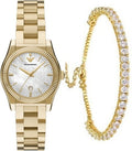 • Emporio Armani's 32 mm watch features a glossy, white mother-of-pearl dial, three-hand date movement, and a gold-tone stainless steel bracelet.