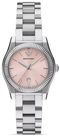 Emporio Armani's 32 mm watch features a striking pale pink sunray dial, three-hand date movement, and a stainless steel bracelet. The fluted stainless steel bezel adds an element of visual intrigue, making the perfect complement to the structured watch case and bracelet.