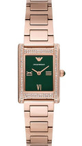 Emporio Armani's 22mm x 32mm watch features a dark green glossy dial, two-hand movement and rose gold-tone stainless steel bracelet.