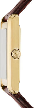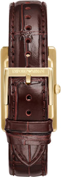 Emporio Armani's 25 x 38mm rectangular watch exudes a polished air with its off white matte dial and two-hand date movement. The brown, crocodile-patterned leather strap complements the sleek pale gold-toned stainless steel case.