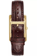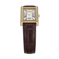• A rectangular gold-tone stainless steel case frames the dial. The case measures 25mm in diameter.