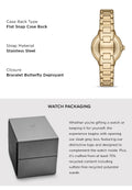 Emporio Armani's 32mm watch features an eggshell sunray dial, three-hand movement and gold-tone stainless steel bracelet. This wristwatch from Armani Exchange is crafted for the moments that matter most. The watch dial is protected with mineral glass and is water resistant up to 50 m. The timepiece works on a quartz movement.