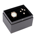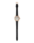 • Watch Band: Black, genuine leather band with a secure single prong strap buckle closure which is self adjustable for a customized fit