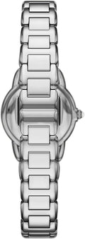 • Emporio Armani's 26mm petite stainless steel watch showcases a glossy white mother-of-pearl dial in a round case with a two-hand quartz movement. The sleek stainless steel bracelet makes this a beautiful addition to an ensemble for any occasion.