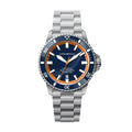 Sea Explorer is a 42.5mm automatic dive watch featuring sapphire crystal and Super-LumiNova® on hands, indexes and bezel markings for optimal visibility in dark underwater conditions. As indicated by the "Diver's" marking on the dial, this watch is ISO 6425 certified, making it expertly equipped for deep-sea diving up to 200 meters. This iteration boasts a glossy blue enamel dial with orange accents and an integrated stainless steel bracelet.