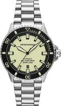 The Emporio Armani Sea Explorer Automatic Silver Stainless Steel Watch AR60083 perfectly combines adventure-ready functionality with sophisticated style. Designed for the modern man, this 42.5 mm timepiece features a striking light yellow Super-LumiNova® dial that remains legible in any lighting, complemented by luminous hands and markers. The robust automatic movement ensures reliable timekeeping, eliminating the need for batteries.