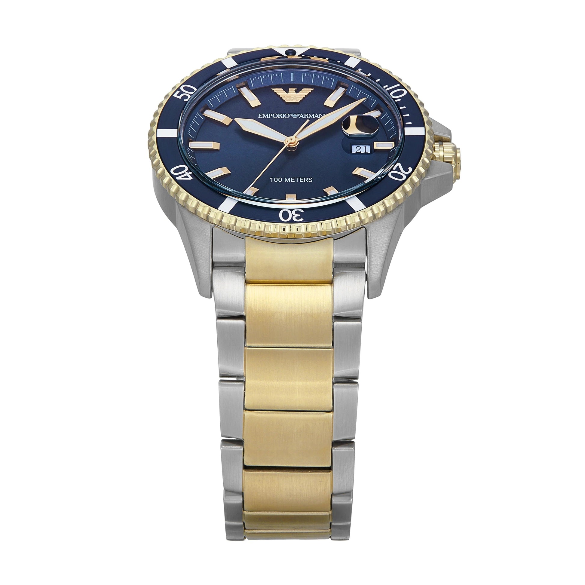 Emporio Armani's 42mm World Explorer watch features a striking blue sunray dial, three-hand date movement, and a two-tone stainless steel bracelet. Elevated design details like luminous accents on the hands, indexes, and bezel markings, and a magnifying window over the date at 3 o'clock, combined with the sport-driven design aesthetic, make this watch perfect for any occasion.