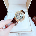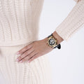 A fusion of sport and fashion unite with this stunning silhouette with a full double row of crystals, cut-thru chrono-look multi-function with glitz details on the dial and a signature flex strap with croco-embossed leather on silicone.