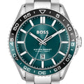 Discover the Hugo Boss 1514208, a striking men's watch featuring a dark green dial and stainless steel case. With a day calendar indicator and push-button deployment clasp, this timepiece combines elegance and functionality for the modern man.