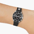 The case is suspended on a comfortable, flexible strap made of black plastic, ensuring all-day comfort. The black dial is perfectly legible thanks to contrasting white and silver indices and hands. The hands and indices are coated with Neobrite , a phosphorescent material that emits light when exposed to light, allowing for reading the time in the dark. The dial is protected by a flat , scratch-resistant mineral crystal , further enhancing the watch's durability.