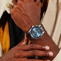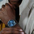 • This chronograph features a sleek blue dial with two sub-dials and a date aperture at 9 o’clock.