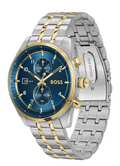 Featuring a dual tone steel strap and deep blue dial, this Hugo Boss Skytraveller is the perfect blend of style, sophistication and innovative design. Every detail has been meticulously considered, from the polished gold bezel and matching gold hands and indices, to the 2 chronograph dials and date aperture, it's sure to do everything you need and more . The mix of stainless steel and gold plated stainless steel links means the Hugo Boss Skytraveller will pair effortlessly with any accessory and with 50m water resistance you can be sure the Skytraveller will handle rain and splashes with ease.