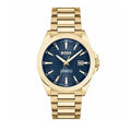 This classic timepiece operates with a quartz movement. The watch's blue dial contrasts beautifully with the gold tones of the case and bezel, creating a sophisticated look. The matching gold strap further enhances its cohesive design. Secured with a deployant clasp, the watch promises both security and comfort on the wrist. Crafted from 316L surgical steel, the watch case is designed for durability, with mineral glass protecting the dial from scratches. Luminous hands ensure visibility in low-light conditions, adding to its practicality.