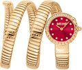 Scratch resistant mineral crystal. Round case shape, case size: 23 mm, case thickness: 10 mm. Band width: 12 mm, band length: 7.5 inches. Water resistant at 30 meters / 100 feet. Functions: hour, minute. Enchanting Snake Series. Fashion watch style. Just Cavalli Enchanting Snake Quartz Red Dial Ladies Watch JC1L302M0035.