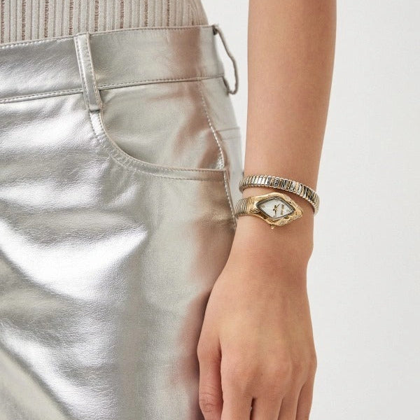 Presenting the Just Cavalli Women's Watch, a remarkable fusion of chic design and exceptional accuracy. This stunning timepiece is more than mere utility; it’s a bold expression of your individuality. Featuring a captivating Two-Tone Silver & Gold Stainless Steel Band, along with an Asymmetrical Gold Stainless Steel Case sized at 22 x 36.5 mm, this watch captures the essence of avant-garde sophistication. The radiant White Mother of Pearls Dial adds a layer of charm, ensuring it stands out in any setting.