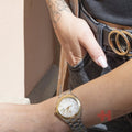 The slim, 32mm steel case is trimmed by a yellow gold plated fixed bezel. The dazzling dial combines diamond indexes with yellow gold plated details throughout. The look is alluring and seductive, for strong, confident women unafraid of fully expressing their femininity.