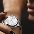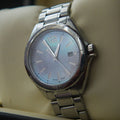 A slender, 32mm case in hand polished and brushed steel with luminous mother-of-pearl dial. The look is feminine and sophisticated, yet the timepiece comes fully loaded with all the robust attributes of a true sports watch.