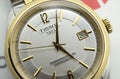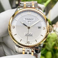 The watch face is divided into 3 distinct rings and is harmoniously designed with a blend of gold tones in the necessary details on a white background, making it stand out, easier to see and more luxurious. The minute markers are located on the outermost part of the watch face. Interspersed with the markers are even 5-minute numbers. The middle ring is the hour markers with a more modern Arabic numeral and bar system compared to the classic Tissot Le Locle. Tissot watch brand and the year of establishment 1853 is placed at the 12 o'clock position, which is quite recognizable and wants to emphasize the brand's history.