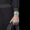 The green dial of this watch is protected by a scratch-resistant sapphire crystal, ensuring durability and clarity for years to come. The stainless steel band in a matching silver tone features a butterfly or fold-over clasp for a secure and comfortable fit.