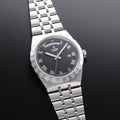 • Black sunray-finish dial with stainless steel hands and applied Roman numeral hour markers
